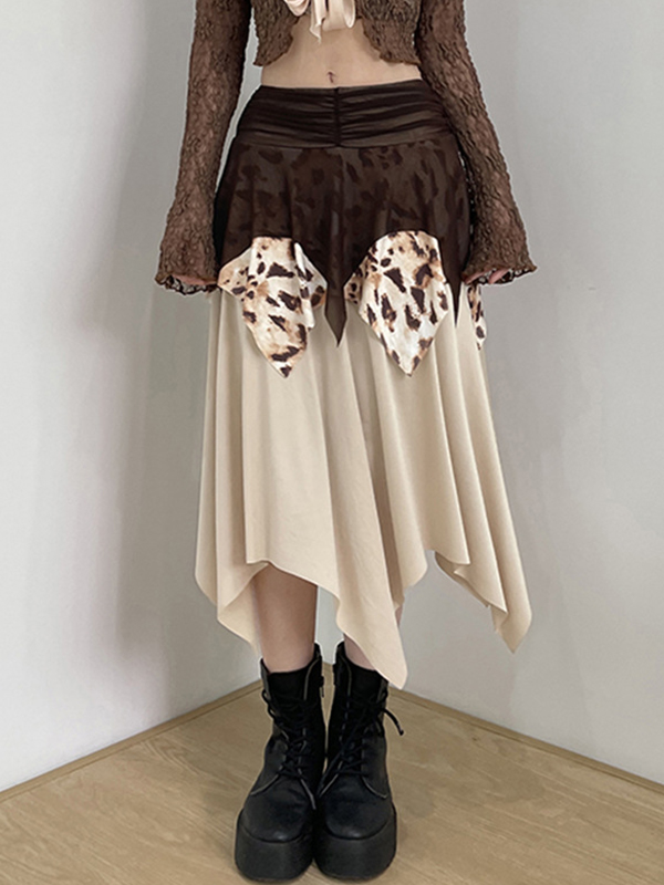 Falda larga irregular con parches de malla y estampado de leopardo