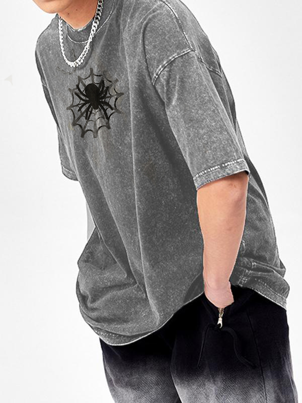 Camiseta de manga corta extragrande lavada con estampado de arañas para hombre