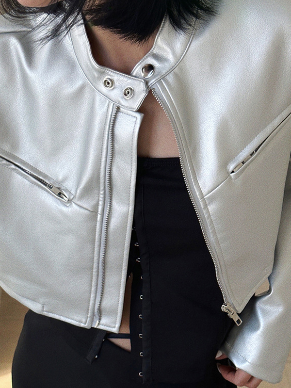 Chaqueta corta de cuero con cuello alto color plata