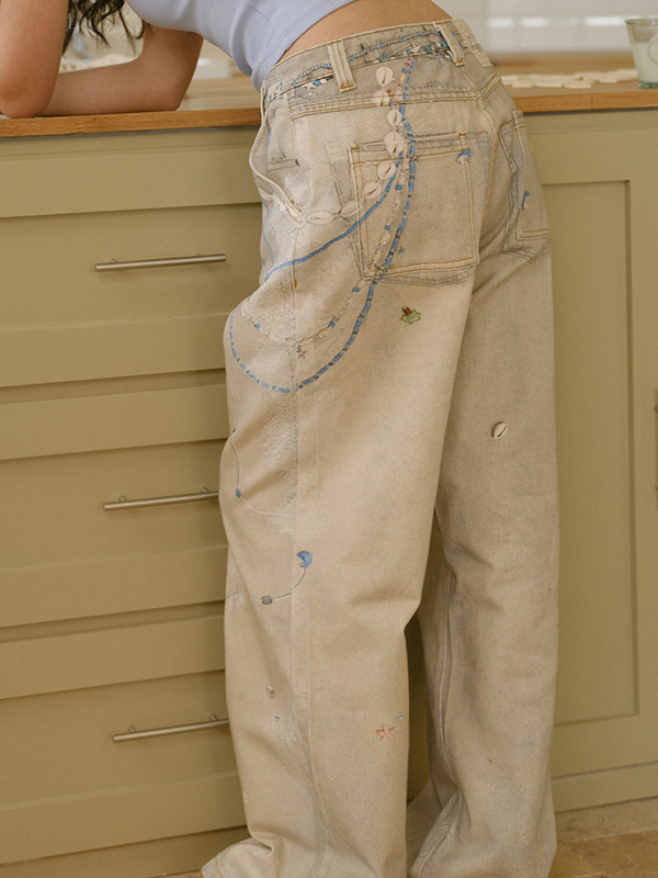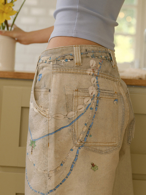 Vaqueros boyfriend con estampado de transferencia en frío y encaje de perlas